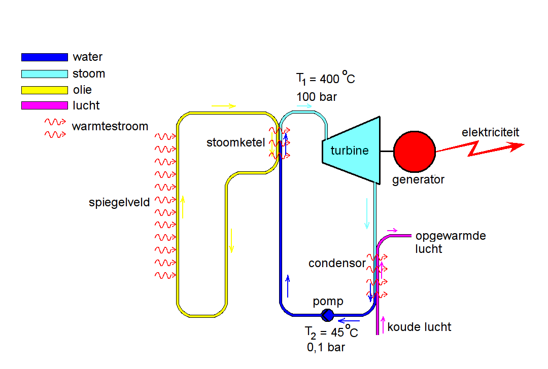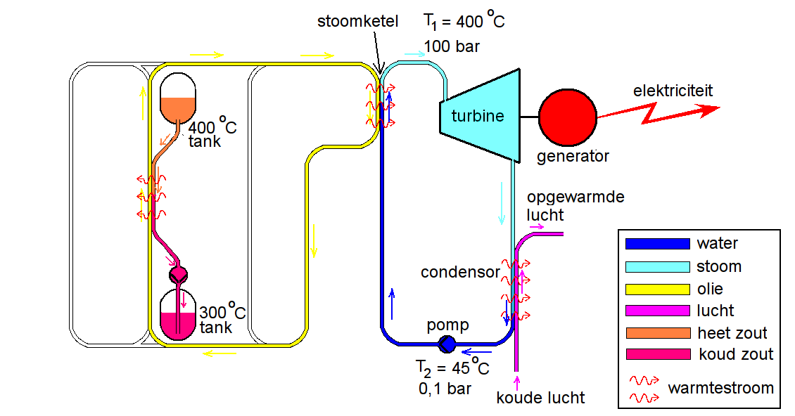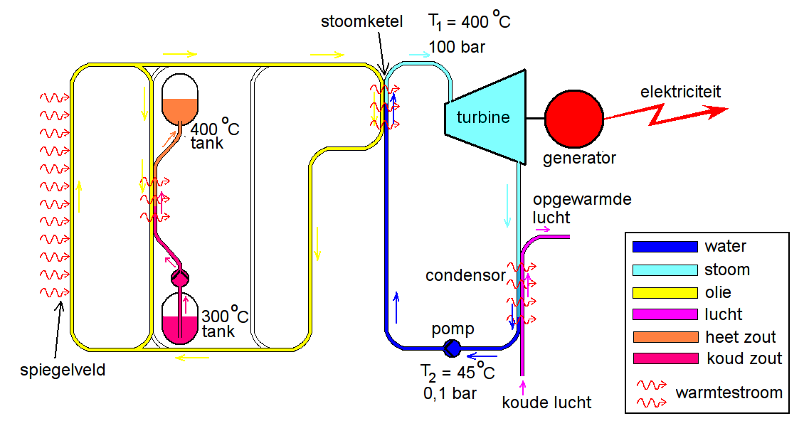 Na zonsondergang worden de stroomrichtingen in de warmtewisselaar tussen de olie en het vloeibare zout omgekeerd, de warmte uit het vloeibare zout wordt afgestaan aan de olie, en met die olie wordt in de stoomketel stoom geproduceerd.